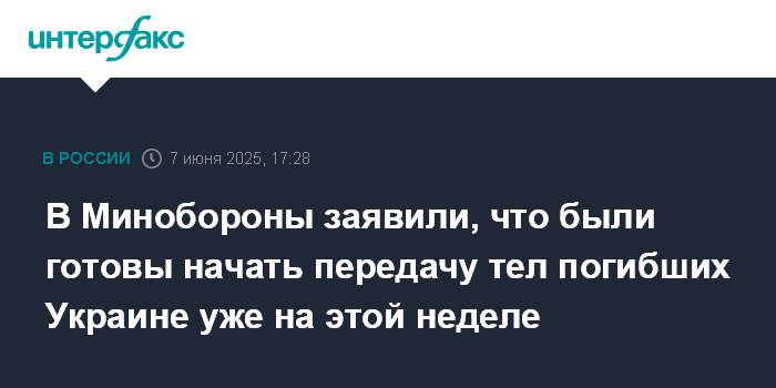 Москва. 7 июня. INTERFAX.RU - Россия уже на этой неделе была готова начать передачу Украине тел погибших в рамках договоренностей, которые были достигнуты в Стамбуле, заявил замминистра обороны РФ генерал-полковник Александр Фомин.