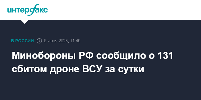 Москва. 8 июня. INTERFAX.RU - Российские военные сообщили, что за сутки уничтожен 131 украинский беспилотник.