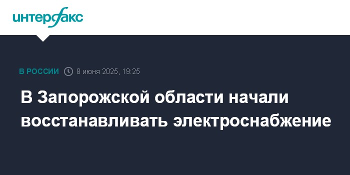 Москва. 8 июня. INTERFAX.RU - Специалисты завершили восстановительные работы после обстрела электросетевой инфраструктуры Запорожской области, сообщает в воскресенье Минэнерго региона.