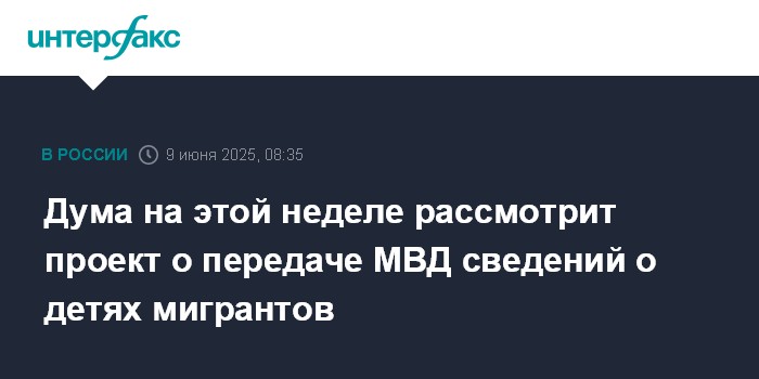 Москва. 9 июня. INTERFAX.RU - Законопроект о передаче региональными и муниципальными органами управления в территориальные подразделения МВД сведений о несовершеннолетних иностранных гражданах Госдума рассмотрит на этой неделе, сообщил председатель палаты парламента Вячеслав Володин.