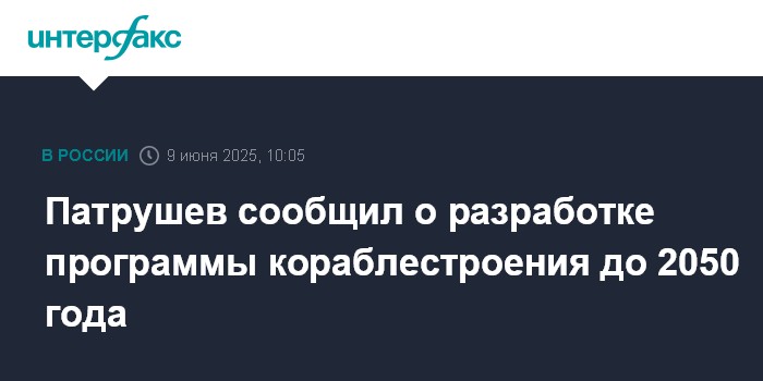 Москва. 9 июня. INTERFAX.RU - Программа кораблестроения до 2050 года разрабатывается в России в развитие принятой Стратегии развития Военно-морского флота на этот же период. Об этом сообщил помощник президента РФ, председатель Морской коллегии Николай Патрушев.