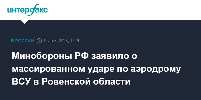 Москва. 9 июня. INTERFAX.RU - Нанесен ночной массированный удар по украинскому военному аэродрому в Ровенской области, сообщило Минобороны России в понедельник.