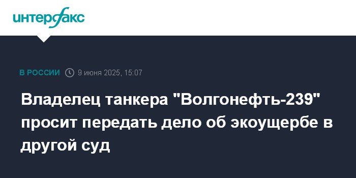 Москва. 9 июня. INTERFAX.RU - ЗАО "Волгатранснефть", владелец танкера "Волгонефть-239", потерпевшего крушение в Керченском проливе в декабре 2024 года, подало ходатайство в Арбитражный суд Краснодарского края о передаче дела по взысканию с компании экологического ущерба другому суду.