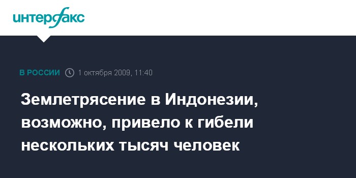 Москва. 1 октября. INTERFAX.RU - Власти Индонезии признают, что землетрясение, произошедшее в среду близ города Паданга, возможно, привело к гибели нескольких тысяч человек, сообщает агентство ЭФЭ. "Я полагаю, что, с учетом масштаба разрушений, у нас будут тысячи жертв", - заявила в пятницу журналистам министр здравоохранения Сити Фатиллах Супари. Со своей стороны, индонезийское министерство по социальным вопросам подтвердило в четверг факт гибели 467 человек, причем 376 из них - жители Паданга. Кроме того, серьезные травмы получил 421 человек, передает ЭФЭ. По данным спасателей, в Паданге обрушились 500 зданий.