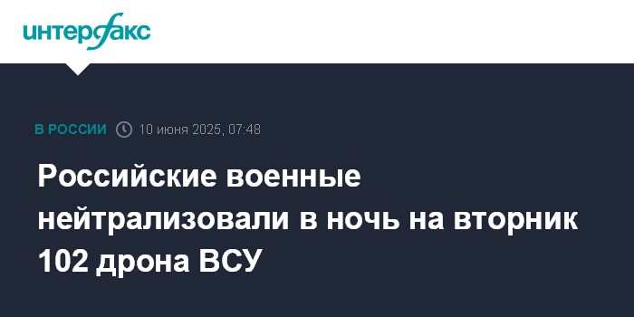 Москва. 10 июня. INTERFAX.RU - Минобороны РФ сообщило, что в период с 21:50 понедельника до 5:50 вторника дежурными средствами ПВО перехвачено и уничтожено 102 украинских беспилотника.