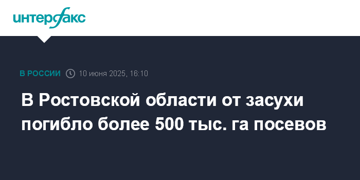 Москва. 10 июня. INTERFAX.RU - Более 500 тыс. га посевов сельхозкультур погибло в 25 районах Ростовской области из-за засухи, планируется ввести режим ЧС в 10 районах, где зафиксированы особо опасные погодные явления, сообщает пресс-служба губернатора области.
