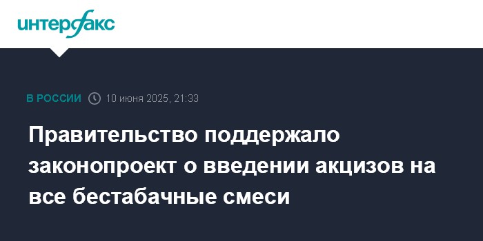 Москва. 10 июня. INTERFAX.RU - Правительство поддержало законопроект об отнесении с 1 января 2026 года к подакцизным товарам всех бестабачных смесей для нагревания, независимо от наличия в них никотина, но рекомендует сенаторам уточнить формулировки, чтобы под акциз не попала пищевая продукция.