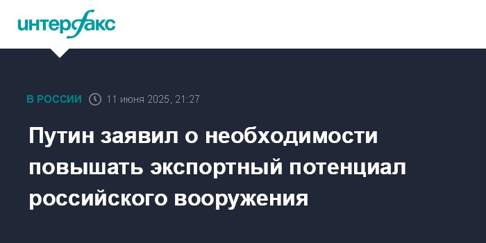 Москва. 11 июня. INTERFAX.RU - Президент РФ Владимир Путин заявил о необходимости повышения экспортного потенциала отечественного вооружения и техники.