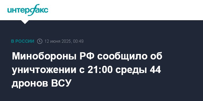 Москва. 12 июня. INTERFAX.RU - Дежурными средствами ПВО с 21:00 среды до 00:00 четверга уничтожено 44 украинских беспилотника, сообщили в Минобороны РФ.