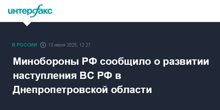 Москва. 13 июня. INTERFAX.RU - Российские военные сообщили, что их наступление на территории Днепропетровской области продолжается.