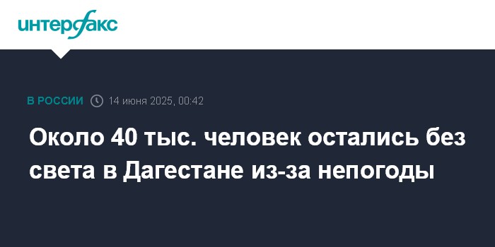 Москва. 14 июня. INTERFAX.RU - Аварийные отключения электроэнергии произошли в Цунтинском, Ахвахском и Тляратинском районах Дагестана из-за дождя и сильного ветра, без электричества оказались почти 40 тыс. человек, сообщает пресс-служба ГУ МЧС России по республике.