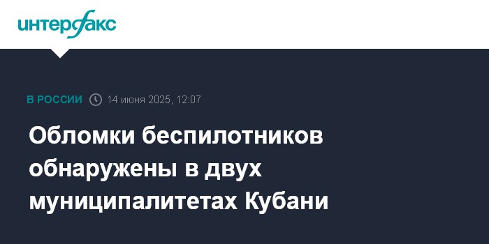 Москва. 14 июня. INTERFAX.RU - Обломки БПЛА обнаружены в Щербиновском и Ейском районах Краснодарского края, сообщает в субботу оперштаб региона.