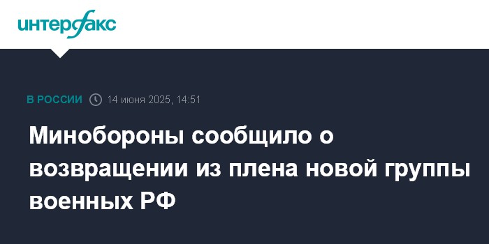 Москва. 14 июня. INTERFAX.RU - Из украинского плена в субботу возвращена еще одна группа российских военнослужащих, сообщило Минобороны РФ.