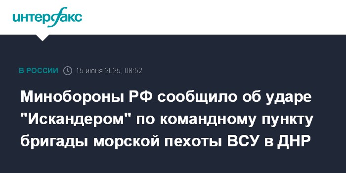 Москва. 15 июня. INTERFAX.RU - Российские военные нанесли удар ракетным комплексом "Искандер" по командному пункту бригады морской пехоты ВСУ в ДНР, сообщили в Минобороны РФ.
