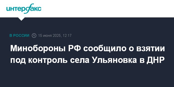 Москва. 15 июня. INTERFAX.RU - Подразделения группировки войск "Центр" взяли под контроль село Ульяновка в ДНР, сообщили в Минобороны РФ в воскресенье.