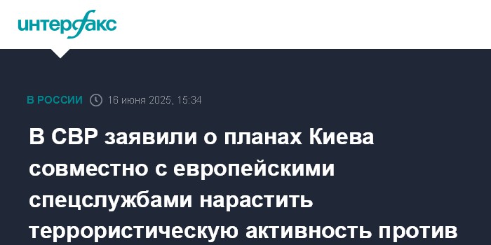 Москва. 16 июня. INTERFAX.RU - Служба внешней разведки (СВР) РФ располагает сведениями о том, что Киев совместно со спецслужбами европейских стран планирует нарастить диверсионную и террористическую активность против России.