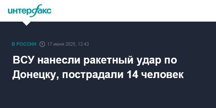 Москва. 17 июня. INTERFAX.RU - Четырнадцать мирных жителей пострадали в результате ракетного удара по Донецку утром во вторник, сообщил глава Донецкой народной республики Денис Пушилин.