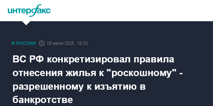 Москва. 18 июня. INTERFAX.RU - Верховный суд (ВС) РФ конкретизировал критерии отнесения единственного жилья гражданина-банкрота к "роскошному", на которое не распространяется иммунитет на взыскание. Таким объектом может признаваться недвижимость, площадь которой кратно превышает разумную потребность семьи должника в жилье.