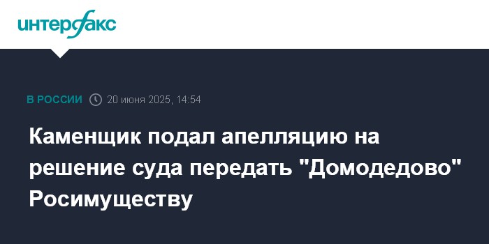 Москва. 20 июня. INTERFAX.RU - Бизнесмен Дмитрий Каменщик, до последнего времени контролировавший аэропорт "Домодедово", подал апелляционную жалобу на решение Арбитражного суда Московской области, по решению которого активы аэропорта были переданы Росимуществу.