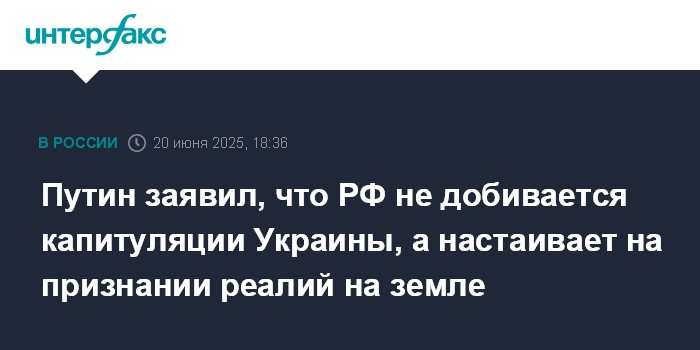 Москва. 20 июня. INTERFAX.RU - Россия настаивает на признании реалий на земле, а не требует от Украины капитуляции, заявил президент РФ Владимир Путин.
