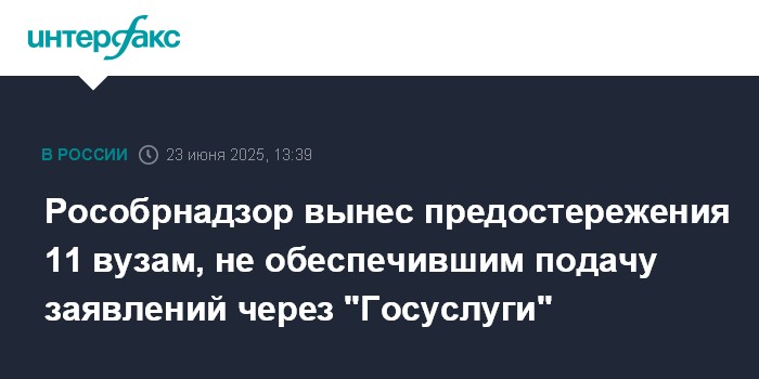 Москва. 23 июня. INTERFAX.RU - Рособрнадзор вынес предостережения 11 вузам, не обеспечившим возможность подачи заявлений от абитуриентов через портал "Госуслуг", сообщили в пресс-службе ведомства в понедельник.