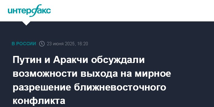 Москва. 23 июня. INTERFAX.RU - Президент РФ Владимир Путин и глава МИД Ирана Аббас Аракчи обсуждали разные вопросы в контексте возможного выхода на мирное урегулирование ближневосточного конфликта, но ситуация пока сложная, заявил пресс-секретарь главы российского государства Дмитрий Песков.