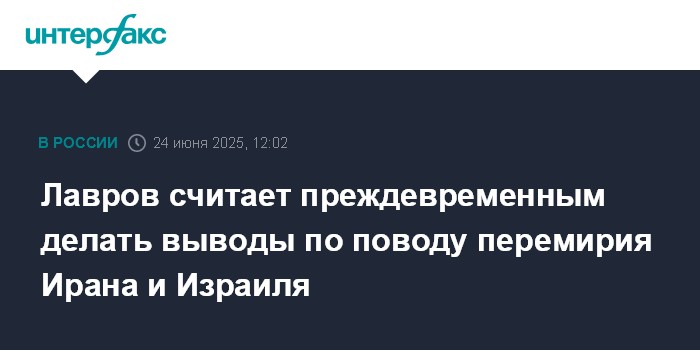 Москва. 24 июня. INTERFAX.RU - Россия приветствует возможные договоренности о прекращении огня между Ираном и Израилем, однако считает, что окончательные выводы относительно складывающейся ситуации делать пока рано, заявил министр иностранных дел РФ Сергей Лавров.