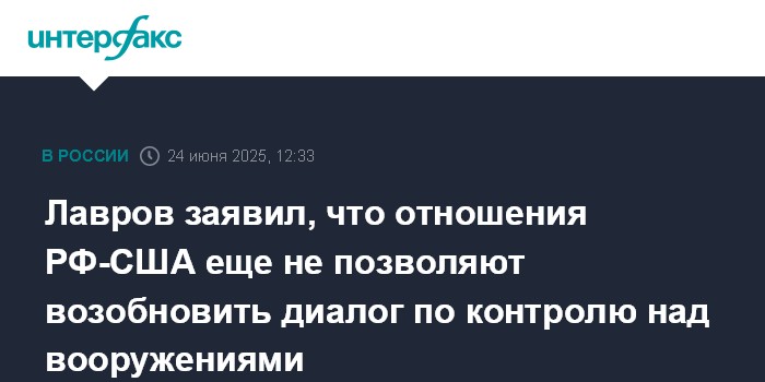 Москва. 24 июня. INTERFAX.RU - Отношения РФ и США пока не вышли на тот уровень, при котором было бы возможно возобновление диалога по контролю над вооружениями, заявил во вторник глава МИД РФ Сергей Лавров.