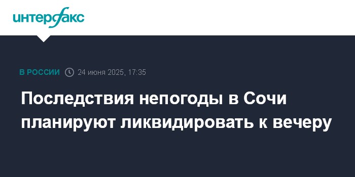 Москва. 24 июня. INTERFAX.RU - Работы по наведению санитарного порядка после ливня и града в городе-курорте Сочи планируют завершить к вечеру, сообщил мэр города Андрей Прошунин во вторник.