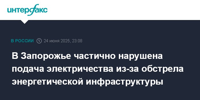 Москва. 24 июня. INTERFAX.RU - Электроснабжение Запорожской области частично нарушено после обстрела энергетической инфраструктуры со стороны ВСУ, сообщил во вторник губернатор региона Евгений Балицкий.