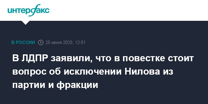 Москва. 25 июня. INTERFAX.RU - Вопрос об исключении главы комитета Госдумы по труду, соцполитике и делам ветеранов Ярослава Нилова из партии и фракции ЛДПР стоит в повестке заседаний высшего совета партии и фракции, сообщила пресс-служба ЛДПР.