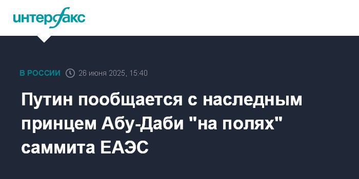Москва. 26 июня. INTERFAX.RU - Президент РФ Владимир Путин "на полях" саммита ЕАЭС пообщается с наследным принцем Абу-Даби, старшим сыном президента ОАЭ шейхом Халедом бен Мухаммедом Аль Нахайяном, сообщил пресс-секретарь главы российского государства Дмитрий Песков.