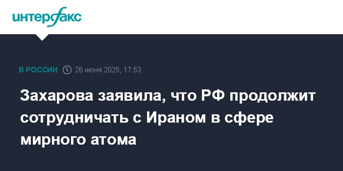 Москва. 26 июня. INTERFAX.RU - Москва намерена продолжить сотрудничество с Тегераном в сфере мирного атома и других областях в рамках двустороннего договора о всеобъемлющем стратегическом партнерстве, заявила официальный представитель МИД РФ Мария Захарова.
