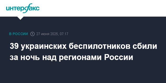 Москва. 27 июня. INTERFAX.RU - Средства ПВО уничтожили 39 украинских беспилотников в течение прошедшей ночи, сообщили в Минобороны РФ.