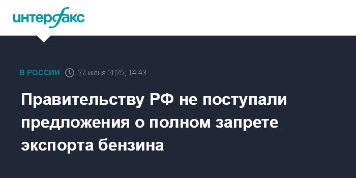 Москва. 27 июня. INTERFAX.RU - Идея о полном запрете на экспорт бензина озвучивалась, но в правительство официальных предложений на этот счет не поступало, сообщил журналистам вице-премьер РФ Александр Новак.