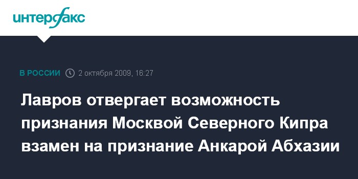 Москва. 2 октября. INTERFAX.RU - Россия не пойдет на торг, предусматривающий признание Москвой Северного Кипра взамен на признание Анкарой Абхазии, заявил глава МИД РФ Сергей Лавров. "Мы не склонны к каким-то разменам по логике ты - мне, я - тебе. Это совершенно разные истории С исторической, моральной, человеческой точки зрения это разные ситуации. Торг здесь неуместен", - сказал С.Лавров, выступая в госуниверситете Абхазии в Сухуми, отвечая на вопрос одного из студентов, возможен ли такой размен между Россией и Турцией. "Каждую ситуацию надо рассматривать в историческом контексте", - сказал он.