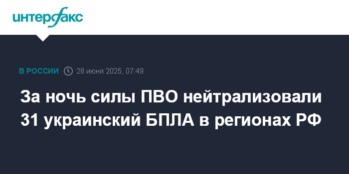 Москва. 28 июня. INTERFAX.RU - 31 украинский беспилотник был сбит в ночь с 27 на 28 июня, сообщает Минобороны РФ.