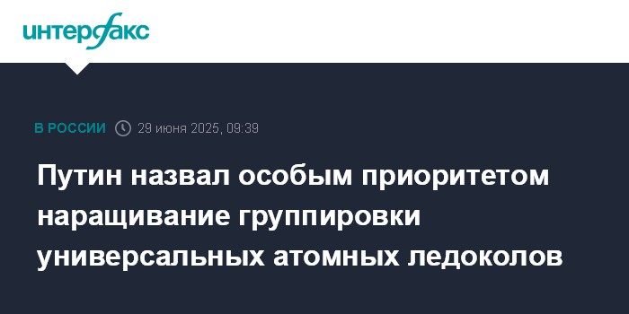 "Особый приоритет - наращивание группировки универсальных атомных ледоколов, судов ледового класса, необходимых для круглогодичной навигации по Трансарктическому транспортному коридору и Северному морскому пути", - отметил президент.