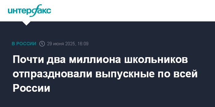 "Более 1,9 млн выпускников из 34,3 тыс. учебных заведений нашей страны уже приняли участие в выпускных вечерах. Во время проведения торжеств правопорядок и общественная безопасность на территории РФ были обеспечены в полном объеме", - написала она в телеграм-канале в воскресенье.
