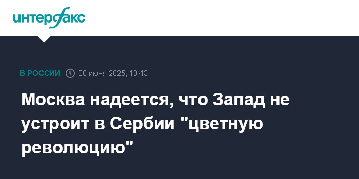 Москва. 30 июня. INTERFAX.RU - Россия надеется на то, что ситуация с протестами в Сербии будет урегулирована в рамках закона и что страны Запада не будут там провоцировать "цветную революцию", заявил журналистам министр иностранных дел Сергей Лавров.