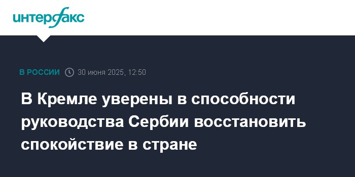 Москва. 30 июня. INTERFAX.RU - В Кремле уверены, что властям Сербии удастся в ближайшее время восстановить законность и спокойствие в республике, заявил пресс-секретарь президента России Дмитрий Песков.