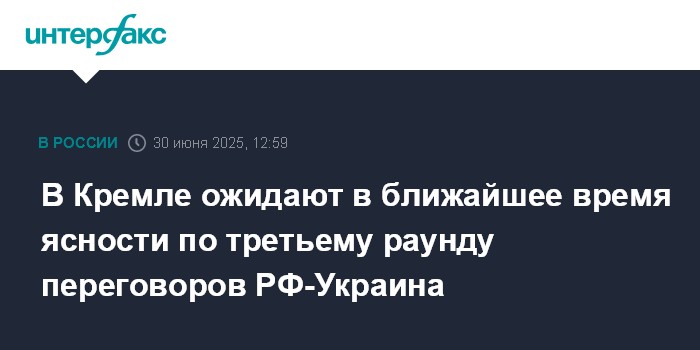 Москва. 30 июня. INTERFAX.RU - В Кремле рассчитывают, что ясность по поводу третьего раунда переговоров между РФ и Украиной появится в ближайшее время.