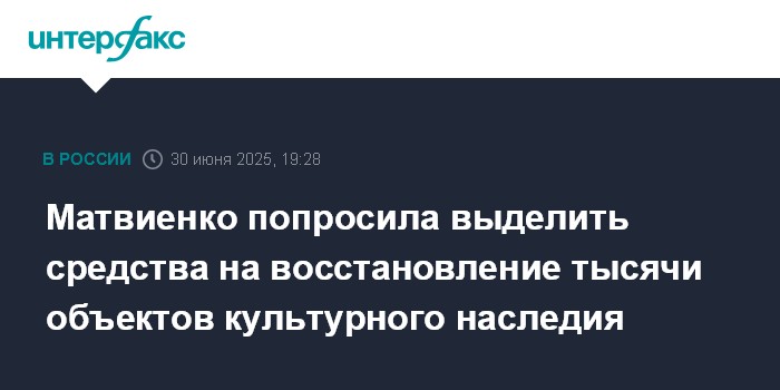 Москва. 30 июня. INTERFAX.RU - Спикер Совета Федерации Валентина Матвиенко попросила правительство РФ предусмотреть в бюджете на следующий трехлетний период средства на восстановление порядка тысячи объектов культурного наследия, находящихся в неудовлетворительном состоянии.