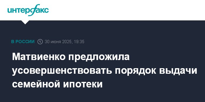 Москва. 30 июня. INTERFAX.RU - Порядок выдачи кредитов по программе "Семейная ипотека" в России необходимо усовершенствовать, заявила спикер Совета Федерации Валентина Матвиенко.