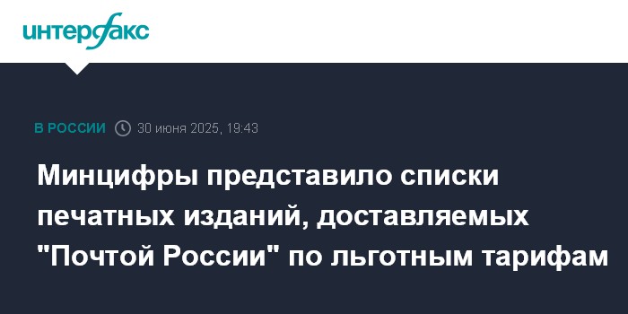 Москва. 30 июня. INTERFAX.RU - Минцифры России подготовило проект приказа, утверждающий перечни федеральных и региональных (муниципальных) социально значимых периодических печатных изданий, доставка которых осуществляется АО "Почта России" по льготным тарифам.