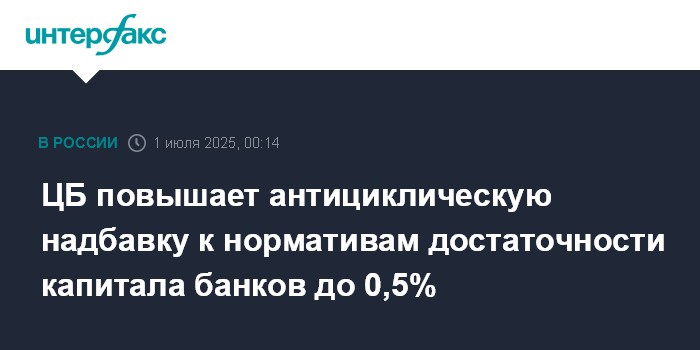 Москва. 1 июля. INTERFAX.RU - ЦБ РФ с 1 июля повышает антициклическую надбавку к нормативам достаточности капитала банков с 0,25% до 0,5% от активов.