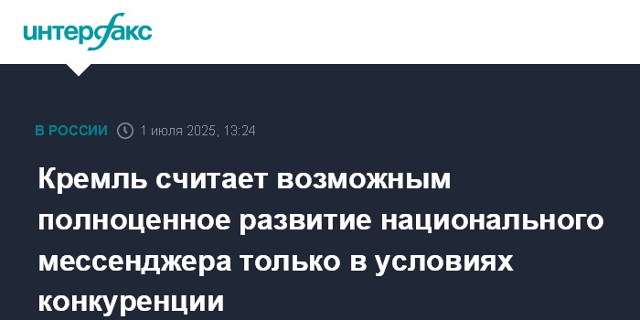 Москва. 1 июля. INTERFAX.RU - Полноценное развитие нового российского мессенджера может осуществляться только в условиях конкуренции, но и действующие программы должны выполнять российское законодательство, заявил пресс-секретарь президента РФ Дмитрий Песков.
