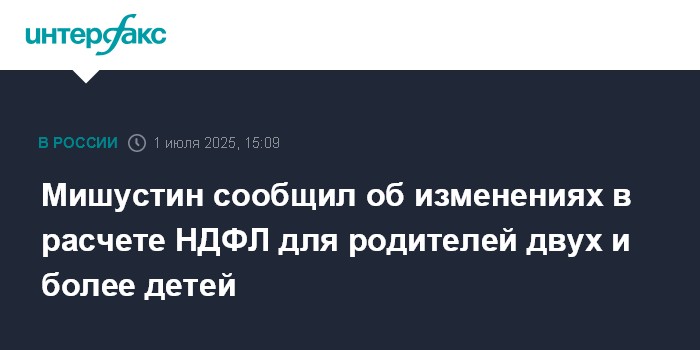 Москва. 1 июля. INTERFAX.RU - НДФЛ для родителей двух и более детей, зарабатывающих менее 1,5 прожиточных минимумов своего региона, с июня 2026 года будет рассчитываться по сниженной ставке в 6%, а разница будет возвращаться им, заявил премьер РФ Михаил Мишустин.