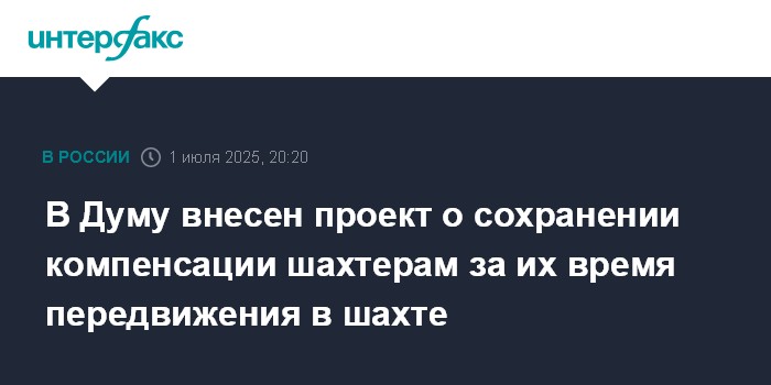 Москва. 1 июля. INTERFAX.RU - Правительство РФ внесло в Госдуму законопроект, закрепляющий с 1 сентября 2025 года обязательную доплату шахтерам за время передвижения от ствола шахты до рабочего места и обратно вне рамок трудового процесса.