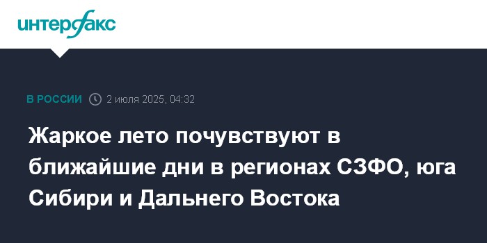 Москва. 2 июля. INTERFAX.RU - Жаркая июльская погода прогнозируется в некоторых регионах Северо-Западного федерального округа, южных регионах Сибири и Дальнего Востока, сообщил "Интерфаксу" научный руководитель Гидрометцентра России Роман Вильфанд.